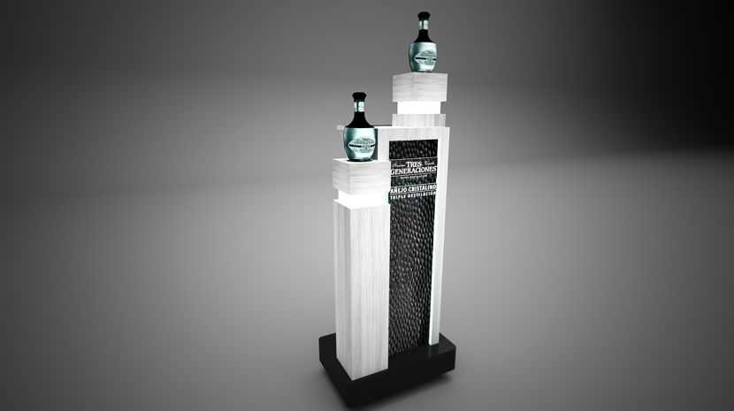 Realizamos un display publicitario con la elegancia del Tres Generaciones Añejo Cristalino. Está inspirado en la botella, con sus transparencias que se reflejan con el color blanco casi metálico y las cajas de luz que iluminan todo el stand, al mismo tiempo, posee una sección negra con el mismo diseño que la botella posee.