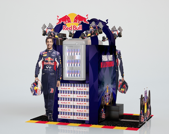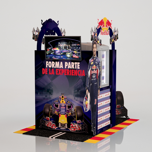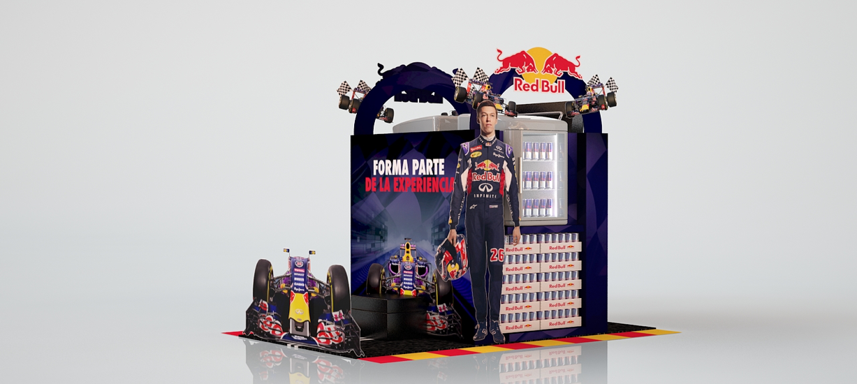 En el evento de Fórmula 1, ya mundialmente conocido, Red Bull posee un equipo filial que participa cada año. Realizamos el diseño, así como estrategia de impulso de venta dentro de Fórmula 1. También diseñamos e hicimos la producción de islas y cabeceras interactivas.
