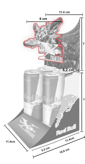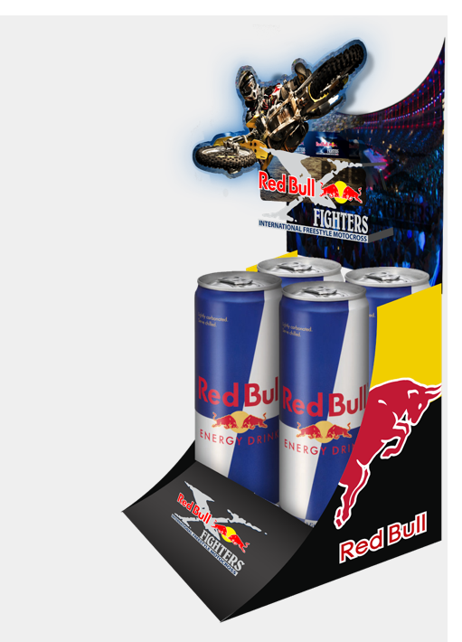 Para Red Bull Fighters diseñamos y produjimos material punto de venta, apoyo gráfico, stoppers y kits promocionales con la imagen de Red Bull Fighters; todo realizado específicamente para dar un impulso de venta. Esta forma de publicidad es poco usual en Red Bull, y sin embargo, nos brindaron toda la confianza para llevarla a cabo, teniendo resultados efectivos e impacto positivo en ventas.